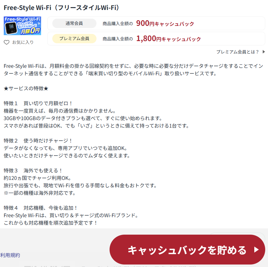 MyCloudアカウントにログインして、下画像の【キャッシュバックを貯める▶︎】ボタンをクリックしていただき、Free-Style Wi-Fi(フリースタイルWi-Fi)でお申し込みをしてもらうだけです!