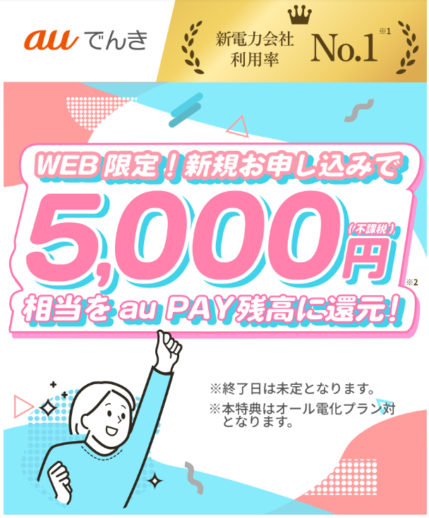 オンラインで「auでんき」を新規申し込みすると、条件達成でau PAY残高5,000円相当が還元されます。切り替えの“最初の一歩”で目に見えるメリットを得られるのが、オンライン経由の強みです。