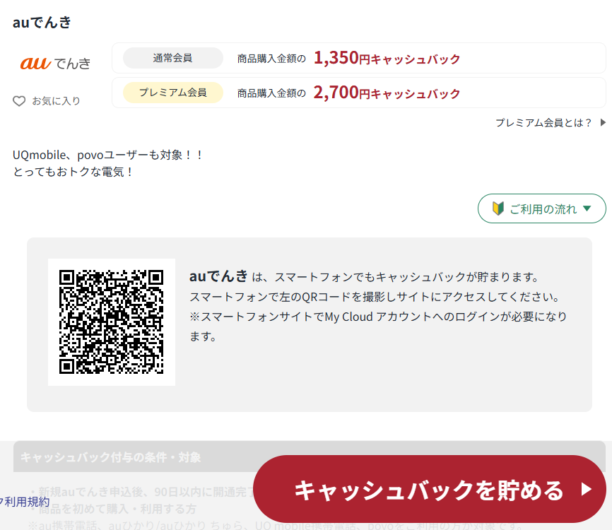 MyCloudアカウントにログインして、下画像の【キャッシュバックを貯める▶︎】ボタンをクリックしていただき、auでんきに切り替えをしてもらうだけです!