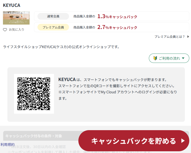 MyCloudアカウントにログインして、下画像の【キャッシュバックを貯める▶︎】ボタンをクリックしていただき、KEYUCAでお買い物をしてもらうだけです!