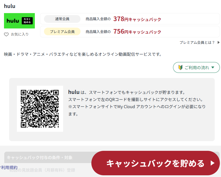 MyCloudアカウントにログインして、下画像の【キャッシュバックを貯める▶︎】ボタンをクリックしていただき、huluでお買い物をしてもらうだけです!