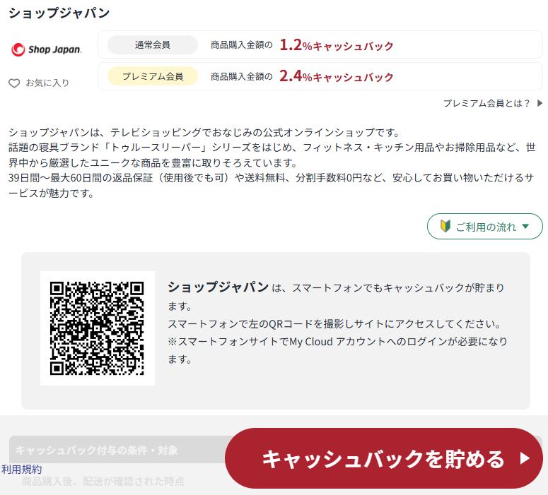 MyCloudアカウントにログインして、下画像の【キャッシュバックを貯める▶︎】ボタンをクリックしていただき、ショップジャパンでお買い物をしてもらうだけです!
