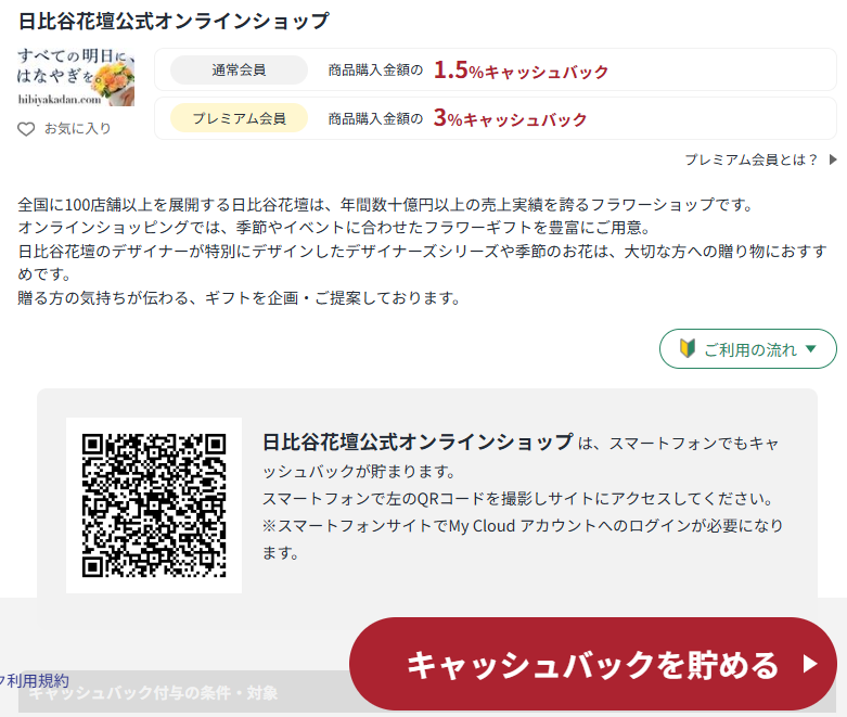 MyCloudアカウントにログインして、下画像の【キャッシュバックを貯める▶︎】ボタンをクリックしていただき、日比谷花壇公式オンラインショップでお買い物をしてもらうだけです!