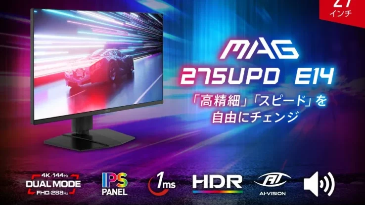 MSIの新型ゲーミングモニター「MAG 275UPD E14」は、4K/144HzとフルHD/288Hzを切り替え可能な「デュアルモード」を搭載し、高画質と高速描画のジレンマを解消します。IPSパネル、1ms応答速度、HDR対応に加え、AIゲーミング機能や充実した使い勝手、そして税込49,800円前後という驚きの価格で、あらゆるゲームジャンルで最高の体験を提供する革新的な一台です。