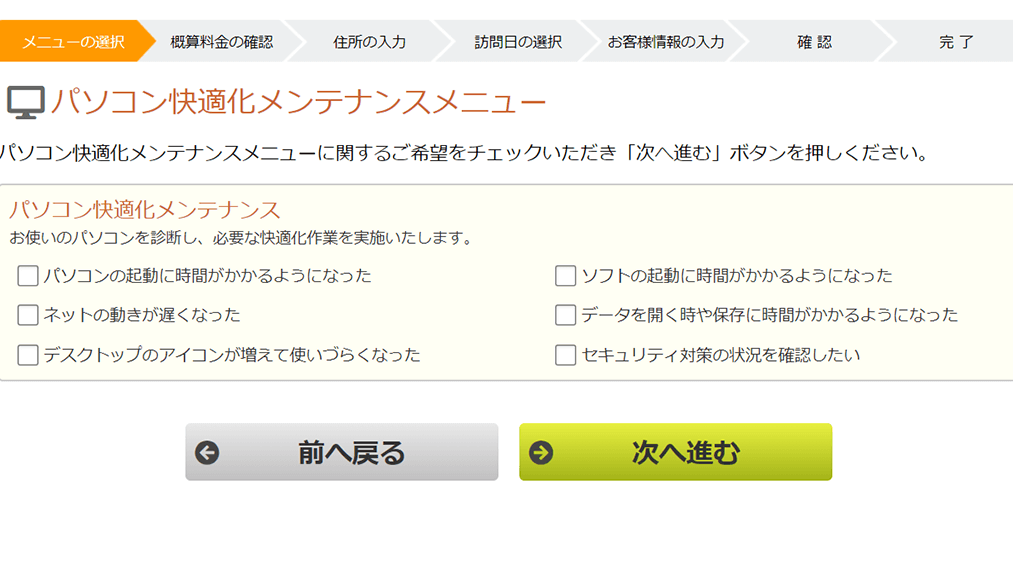 パソコン快適化メンテナンスメニューに関するご希望を選択